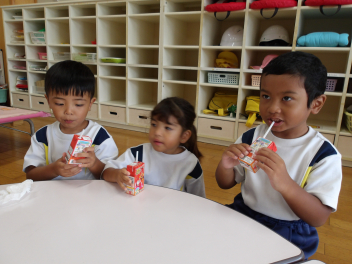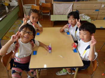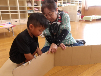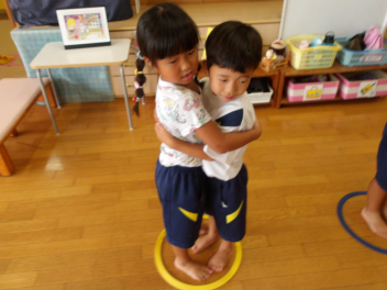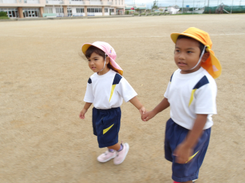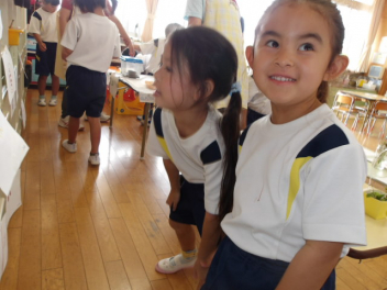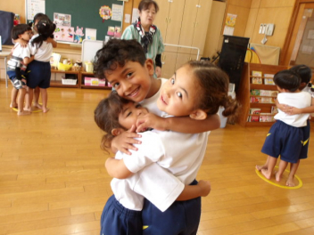 年少と年中は、お休みの子が多かったので、今日はみんな、大きい組に入って過ごしました。最初は緊張していた子も大きい組の優しさに緊張はほぐれ、仲良く手をつないで、遊ぶ姿がいたるところで見られましたcheeky
