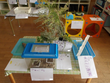 園外へ散歩に出かけ、偶然目にしたものは・・・枯れた葉っぱ、ドングリ、ひもやねじ、バッタやカエルなどなど…wink お土産に持って帰って来た物が一杯です。いつの間にか博物館として展示をしたくなりました年長児の発想と感性が活かされた遊びとなりましたsad明日朝まで展示をしておくので、良かったらそら組へお立ち寄りくださいsad