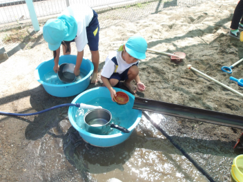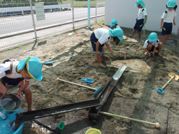 年長は、砂場一面を使って草のプールを作ろうと試行錯誤しながら水を流しました