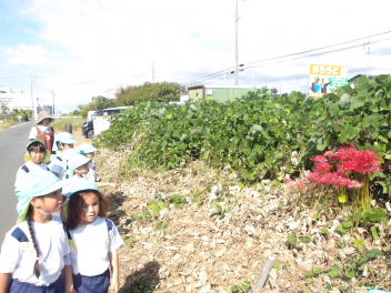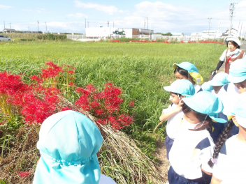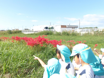 「ヒガンバナを見つけたよ」の声に「見に行こう」と言うことになり、そら組さんが散歩に出かけましたsad