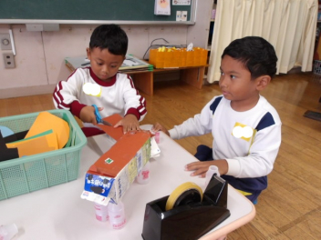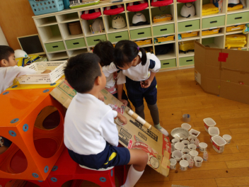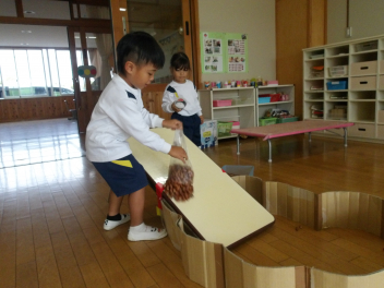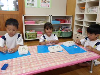 にじ組の子たちは、お姉さんたちと大好きなブロック遊びをしましたfrown