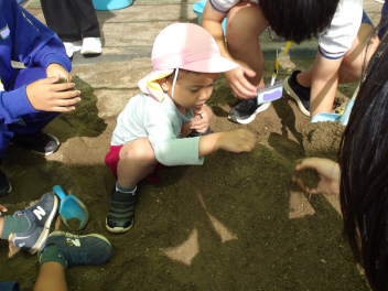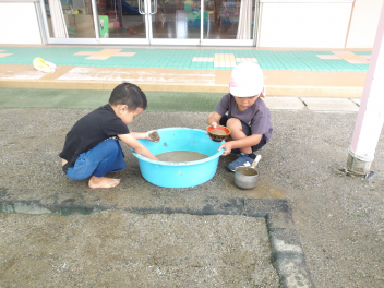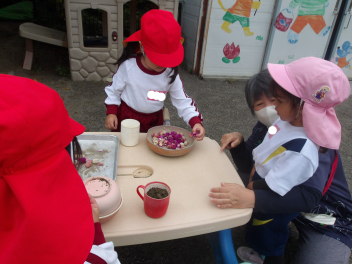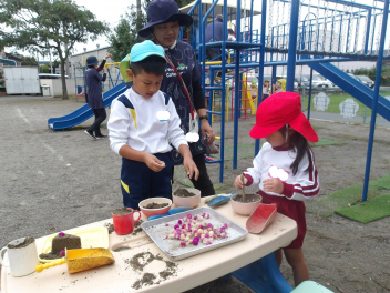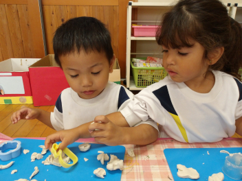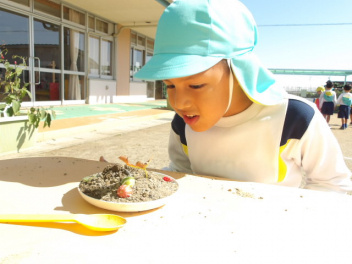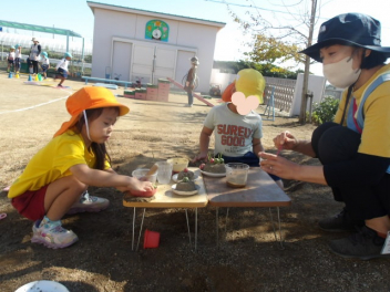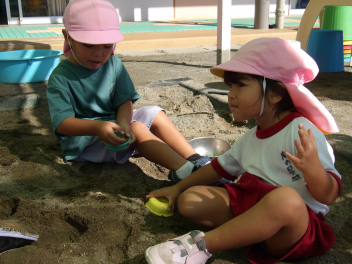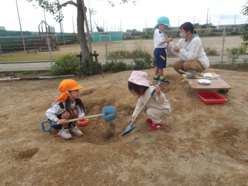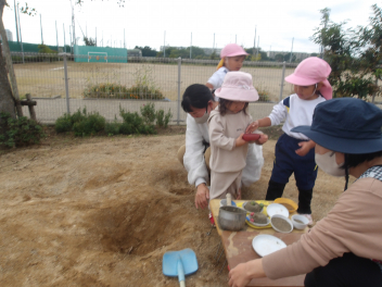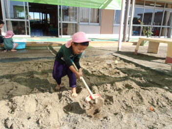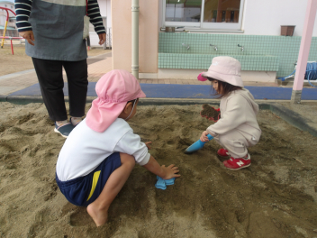 砂場で、型抜きが作れるようになって、何回も作ったり壊したりしていますwink