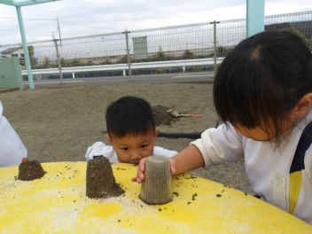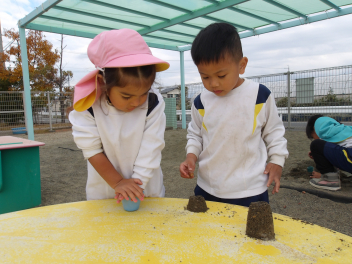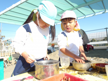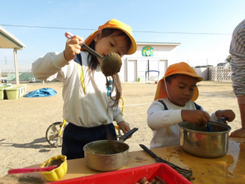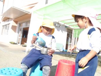 年少同士の砂場でのお料理は、食べてもらって完結します「いただきます」wink