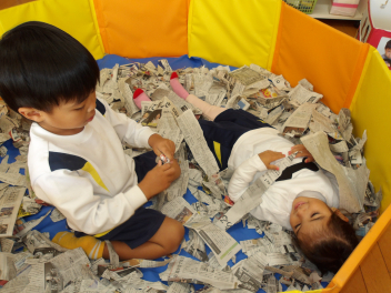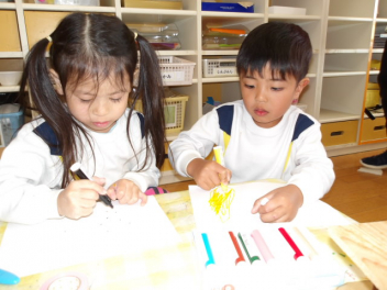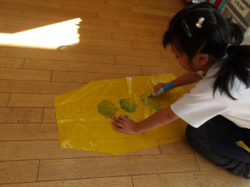 おひさま組さんも、そら組さんのお部屋で絵の具遊びsmiley