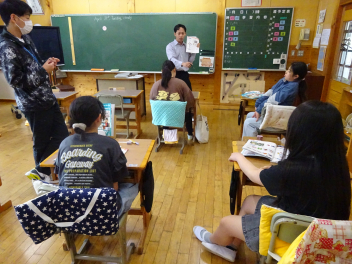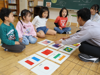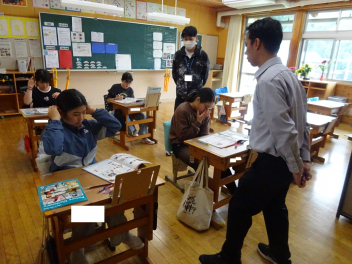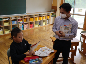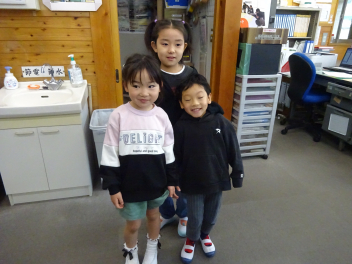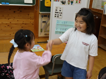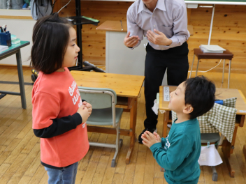 1~3年生は合同で「世界の挨拶」について学習しました。 1年生の2人は、ALTの先生と会うのが初めてで、最初は少し緊張した面持ちでしたが、先生が優しく声を掛けてくださると、すぐに緊張もほぐれたようでした。 2、3年生のお兄さん・お姉さんと一緒に、元気よく「Hello!」や「グーテンターク!」と世界の言葉を言ったり、英語のゲームを楽しんだりしました。