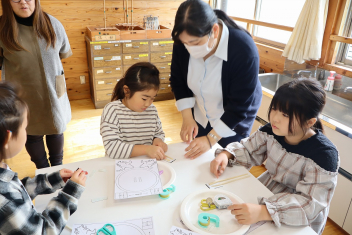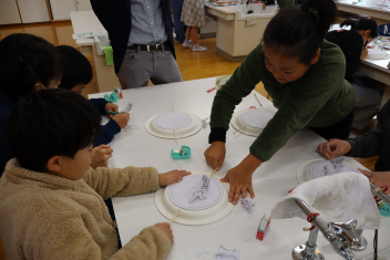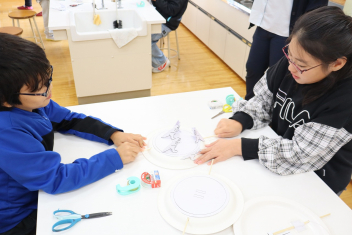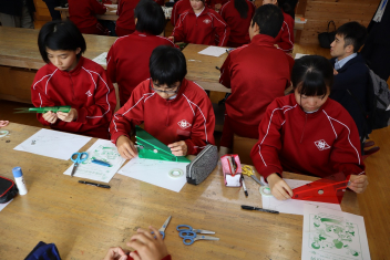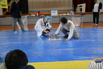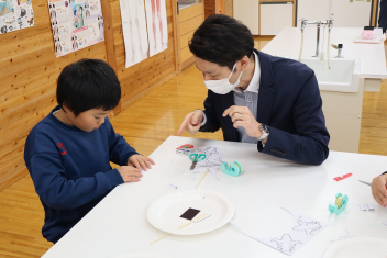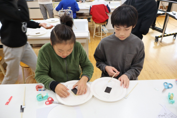 小学校の部では、磁石の振動で、恐竜が相撲をする玩具を作りました。途中、わからない所があると、先生方が優しく教えてくださり、全員完成させることができました。完成した後、友達と実際に遊んで、楽しみました。