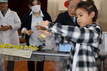 その後、一人ずつ花を液体窒素の中に入れ、その花を触ってみました。花は一瞬で凍ってしまい、触るとパキパキと割れて粉々になってしまいました。普段できない実験に、子供たちだけでなく、大人もとても楽しそうにしていました。