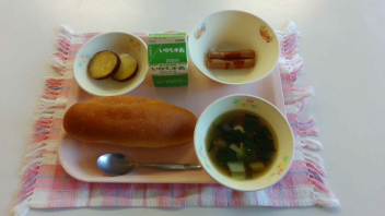 今日の給食は、黒砂糖入りパン、牛乳、ウインナーソーセージ、さつまいものバター煮、タアサイとうずら卵のスープです。長~いウインナーだったので、半分に切ってもらいました。地面に張り付いて太陽の光をたっぷり浴びれる形をしています。寒くなると肉厚になり、甘味を増すタアサイを使ったスープです。濃い緑が映え優しい味に仕上がりました。