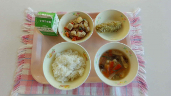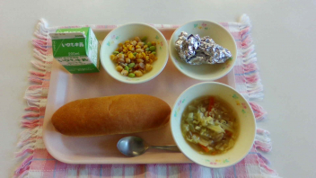今日の給食は、パン、牛乳、鮭の香草焼き、ウインナーとビーンズのソテー、アルファベットスープです。鮭には、バジルとパセリを効かせて、魚の臭みをとって調理しました。ソテーも彩よく仕上がりました。