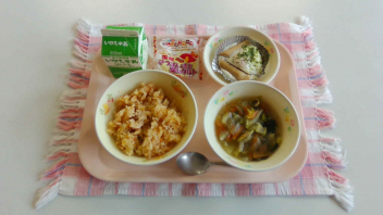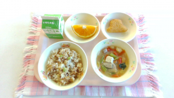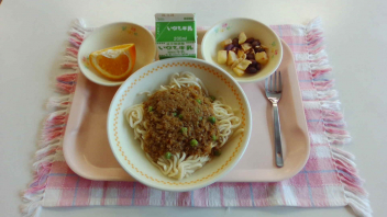 今日の給食は、ソフトめん、牛乳、みそカレーソース、ミックス揚げ、いよかんです。みそカレーソースは、ほんのりカレーの香りがした、甘じょっぱい味付けで食べやすかったようで時間内に食べ終わる子が多かったです。デザートのいよかんもさっぱりした甘みで好評でした。