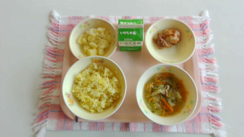 今日の給食は、カレーご飯、牛乳、レモンチキン、こふき芋、ジュリエンヌスープです。久しぶりにジューシーな鶏モモ肉を使いました。味もしっかり染みて柔らかく焼き上がりました。ジュリエンヌスープは、キャベツや人参、セロリーと野菜たっぷりの食べ応えのあるスープでした。食べやすかったようで残食が少なかったです。食後に机といすの高さ調節をしました。いい姿勢で、食事のマナーを身につけてもらえると思います。