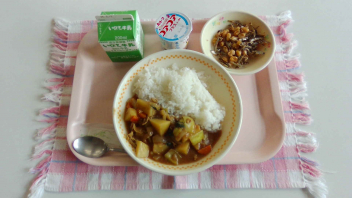 今日の給食は、ごはん、牛乳、豚肉とチンゲンサイのカレー、大豆と小煮干しの甘辛あえ、ヨーグルトです。子供たちが大好きなカレー、浜松特産のチンゲンサイも入って具沢山です。噛み応えのある大豆と煮干しの甘辛あえもつきました。パクパクとついあまり噛まないで食べてしまいがちなカレーですが、噛むことを意識して食べてほしいです。