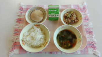 今日の給食は、ごはん、牛乳、豚丼の具、わかめスープ、手作りいちご蒸しパンです。豚丼の具をごはんにかけておいしそうに食べていました。あっさりしたわかめスープの組み合わせも食べやすかったようです。手作りいちご蒸しパンは、きれいなピンクにはなりませんでしたが、香りと味は、楽しめました。
