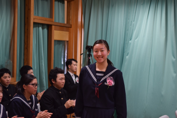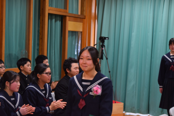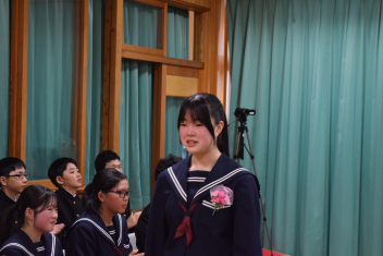 各学年の代表に修了証が渡されました。そして、1,2年の代表生徒が一年間の振り返りを発表しました。修了証を受け取った代表生徒も、振り返りを行った生徒も、それぞれに一年間の大きな成長を感じる素晴らしい態度、発表でした。