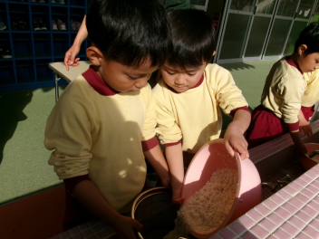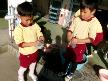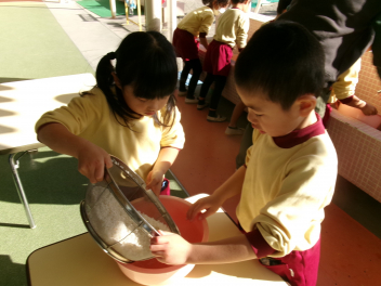 水の中でグルグルかき混ぜる!こぼさないように気を付けてsmiley
