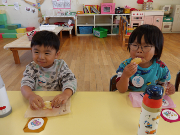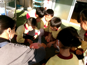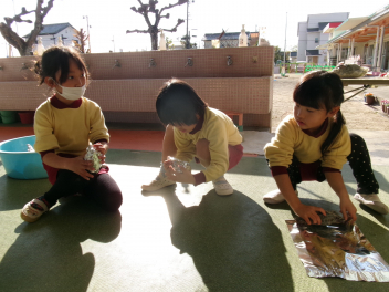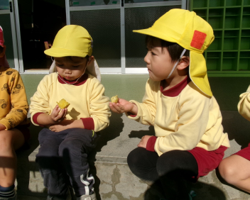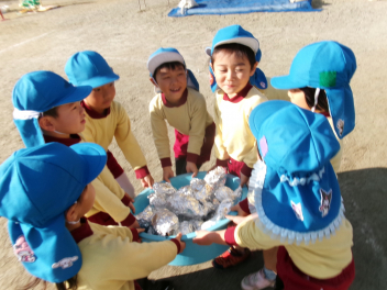 たきびの煙と焼いもから出る湯気の煙のにおいの違いや、焼けたばかりの焼き芋の熱さやおいしさなど、五感を通して焼いもパーティーを楽しみましたwink