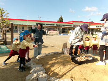 朝からボランティアさんがもち米を蒸す準備を始め、煙がモクモクする中での登園になりましたangel