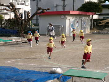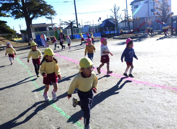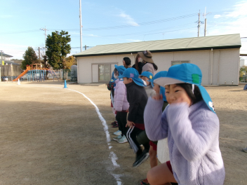 すぐに砂場で遊ぶのは凍えてしまう…ということで、マラソンをして体を温めました