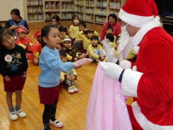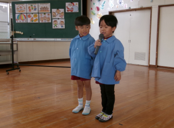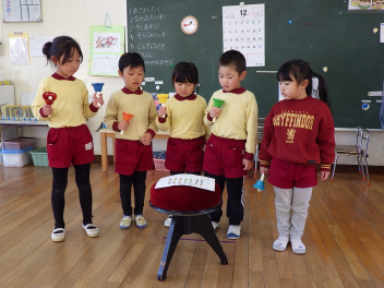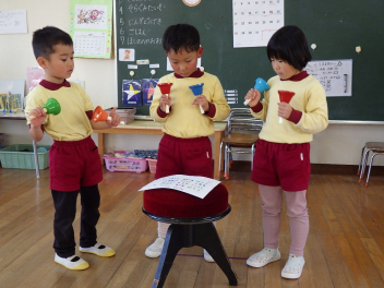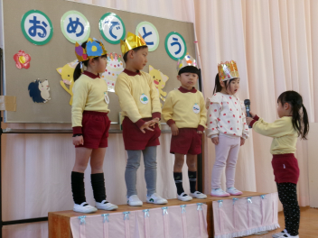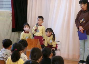 12月の誕生会は、11月の誕生会をお休みした友達も一緒に前に出て、お祝いしました。