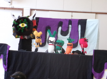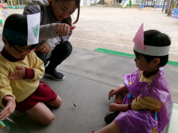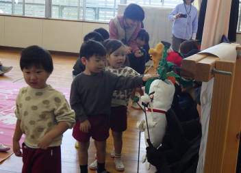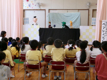 今日は新原幼稚園の友達との交流会で、一緒に人形劇団『こんぺいとう』さんの劇をみました
