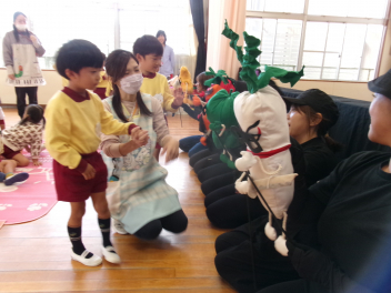 ちょっと怖いけど先生と一緒にベジレンジャーと握手しちゃうsad