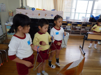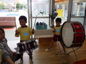 最近楽器遊びを始めた年長さんは、新原の友達を誘って教えてあげながらリズム遊びを楽しんでいました