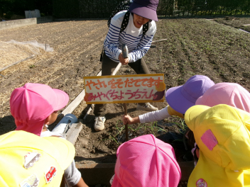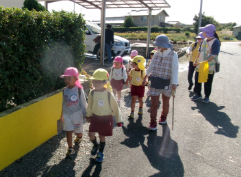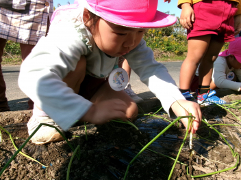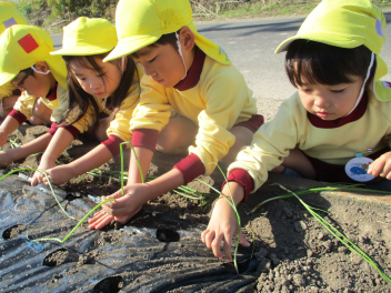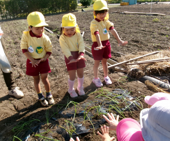 年中・年少さんで手をつなぎ、近所の畑にタマネギを植えに行ってきました。
