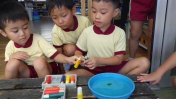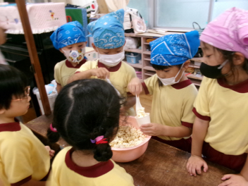 そんな中、年長さんが「今日はポップコーン屋さんをするよ」と誘い掛けてくれたこともあり、年少・年中さんは朝からウキウキ・ソワソワしていました。