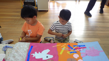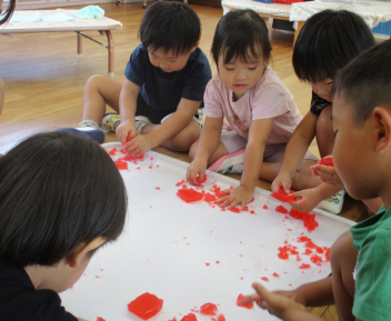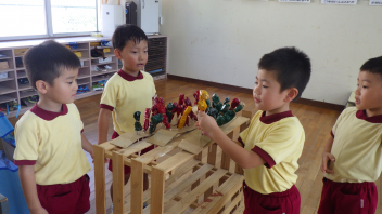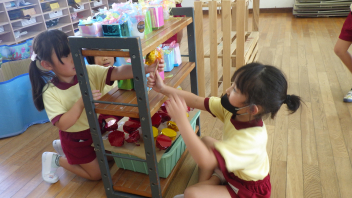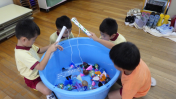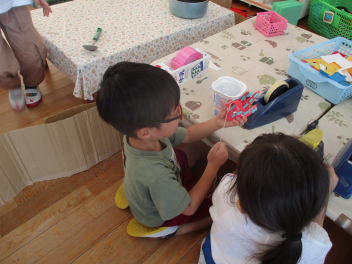 今週末の宮口祭典や、来週ある幼稚園のお祭りごっこに向けて、少しずつお祭りを意識して遊びに取り入れる姿が見られます。
