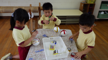 年中さんは丸い障子紙を好きな色に染めて作りました。
