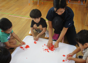 年少さんは寒天の塊で感触遊び