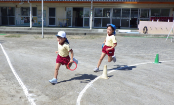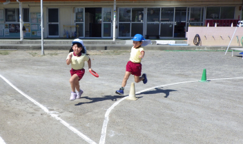 年長さんはリレー対決! 女の子 対 男の子は、男の子チームの勝ち!!