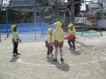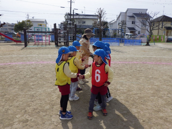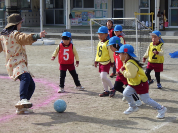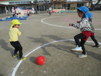 • サッカーやドッジボールなど、年長さんの遊びに触発されて、年中さんからも「ボールで遊びたい!!」と遊びがはじまりました。
