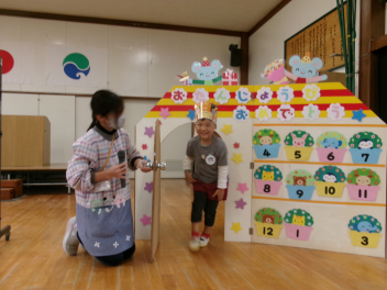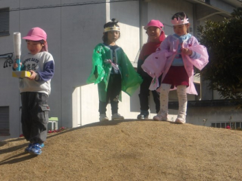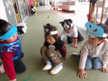 年少さんの友達が鬼のお面をかぶって、外に飛び出すと「鬼をやっつける!」と警察官や犬?も集まってきました。