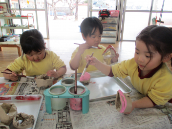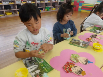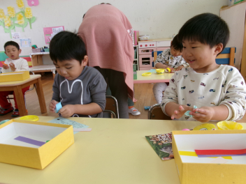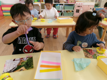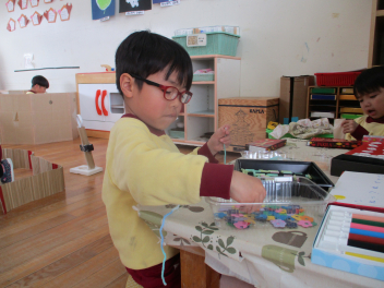 部屋の中では空き箱やストロー・紙皿などを使って、アクセサリーや食べ物をつくって遊ぶ子が増えてきました。