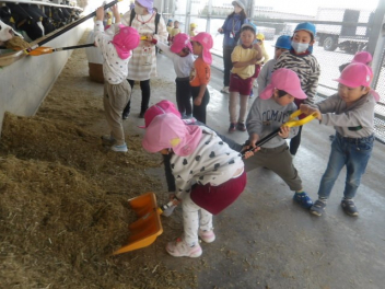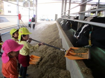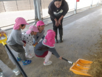 スコップでエサやり、みんなでうんとこしょ!