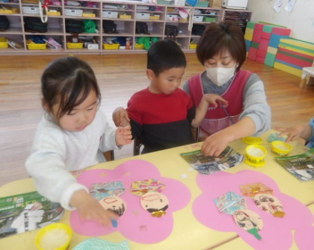 「折り紙の白ちゃんと色ちゃんが仲良しになるようにつけてみよう!」