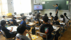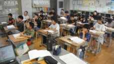 6年生は国語の授業でした。宮沢賢治作「やまなし」を学習していました。五月と十二月の場面を比べながら、なぜ題名が「やまなし」なのか、一人一人がノートに考えを書いていました。