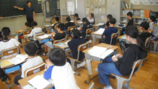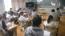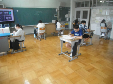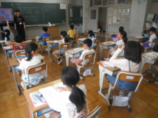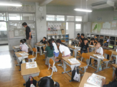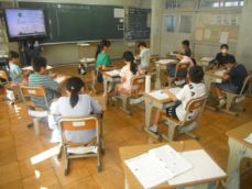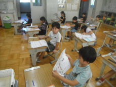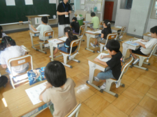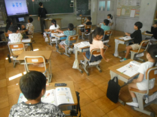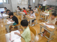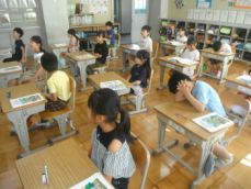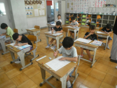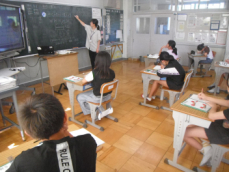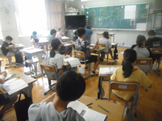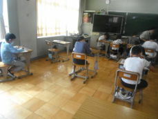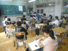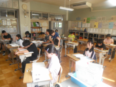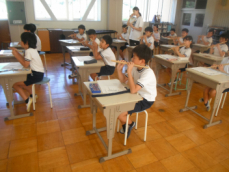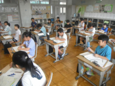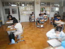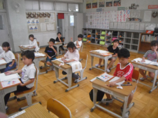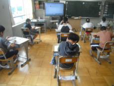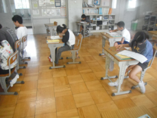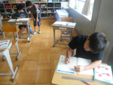 5時間目です。6年生は算数、円の面積のテストに挑戦していました。求積の公式が  半径×半径×3.14  である理由や、円や半円、扇形の面積を求める問題に挑戦していました。私は中学校で数学を習ったときに、3.14 を  π  で表してよいことを知り、「何て楽なんだ!」と思った覚えがあります。