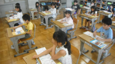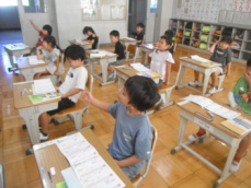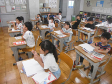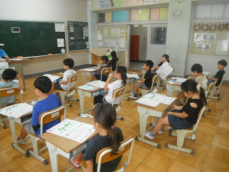 1年生は算数の振り返りプリントに挑戦していました。「12個、色を塗りましょう」や「下の絵で、鳥は何羽いますか」など数の表し方を復習していました。