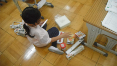 1年生は算数の授業でした。「かたちあそび」という単元で、子供たちは家庭より持ってきた箱を高く倒れずに積むための方法を考えていました。ラップの空き箱の使い方が難しそうでした。