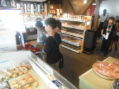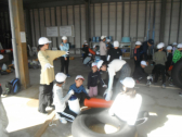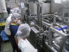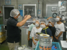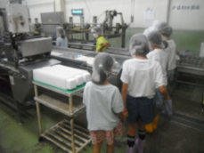 工場に入る前に、子供たちはそれぞれが持参したきれいな靴に履き替えたり、エアシャワーを浴びたり、ヘアーキャップやマスクを着用したりと、須部豆腐店さんが安全な豆腐作りを心掛けていることがよく分かったようでした。また、日に3,000丁以上の豆腐を作っていることを聞いて、驚いていました。さらに、お店の御好意で、子供たちはできたての油揚げや豆腐、おからドーナツを試食でき、たいへん満足そうでした。