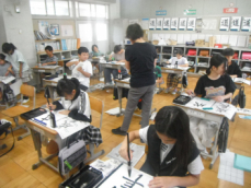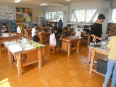 4年生は図工の授業でした。「彫って 刷って 見つけて」という、版画の作品に取り掛かっていました。今日は版木に下描きをしていました。完成が楽しみです。