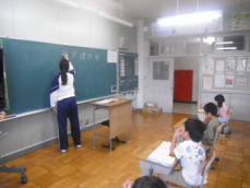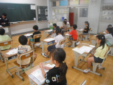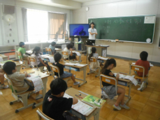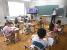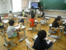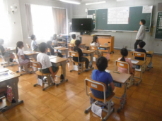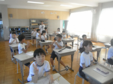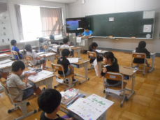 2時間目です。1年生は『くじらぐも』に出てくる「男」や「女」、「青」などの新しい漢字の学習をしていました。特に、「青」については「青空」と「青い空」の送り仮名の違いにも注目していました。