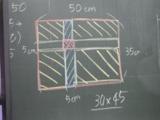 5年生は算数の授業でした。複雑な形の面積の求め方を考えていました。図形を二つに分けたり、一つの正方形や長方形とみなして欠けた部分を引いたりと、一人一人が思い思いの方法で考えていました。そして、その考えを1つの式で表すことにも挑戦していました。