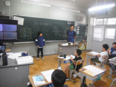3年生は算数の授業でした。「1個10円のあめを4つ買ったら、代金はいくらになるのか数直線を使いながら考えていました。買う数が4倍になれば代金も4倍になる、「比例」の基礎がここに表れていました。