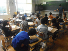3年生は社会科の授業でした。一人一人が机の上に地図を広げ、定規とコンパスで2地点間の実際の距離を求めていました。「縮尺」の意味が分かったことと思います。