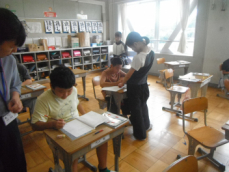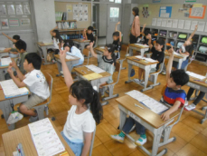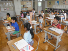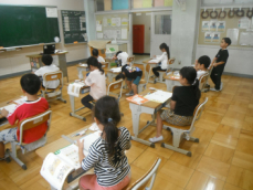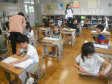 2年生は国語の授業でした。「少」や「理」、「作」などの新出漢字を習っていました。担任に合わせて空書きをし、書き順を確かめていました。