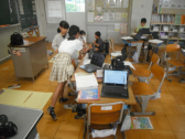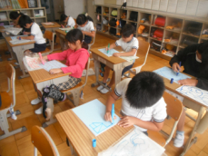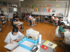 4年生は総合的な学習の時間でした。都田川の流路の変遷や生息する生き物など、それぞれのグループで調べたことを模造紙にまとめていました。完成したら見てみたいものです。