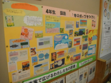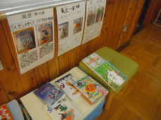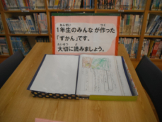 図書室の中に、1、4、5年生がそれぞれ国語の時間に作成した『いきものかくれんぼずかん』、本のポップ、作家で広げるわたしたちの読書、がありました。